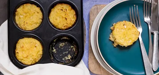 Bestrijk de vormpjes met wat olie en schep het aardappelmengsel erin.