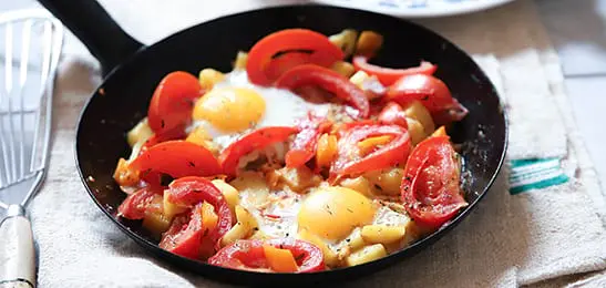 Breek de eieren boven de kuiltjes. Stoof de eieren met een deksel op de pan in 10-15 minuten gaar.