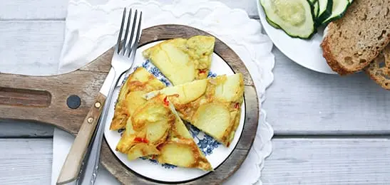 Snijd de omelet in punten. Serveer de courgette en het brood erbij.