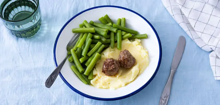 Serveer de aardappelpuree met de sperziebonen en gehaktballetjes.