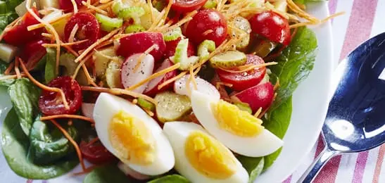 Pel de eieren en snijd ze in parten. Serveer de salade met de parten ei erop.