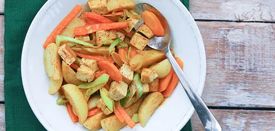 Je kunt tofu ook vervangen door vegetarische blokjes. De kruidenmix kun je makkelijk zelf