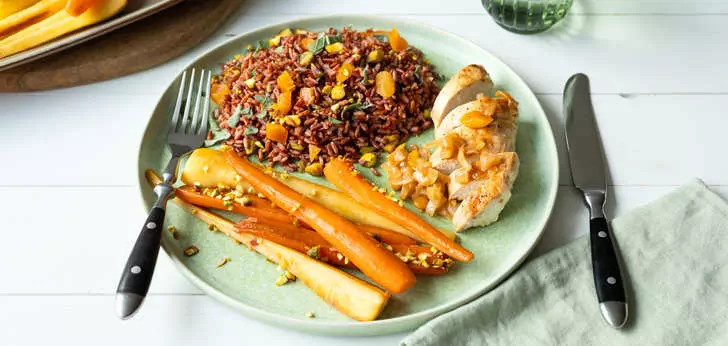De gekaramelliseerde wortel en pastinaak geven het gerecht een zoete tint. Samen met de kip en kleurrijke notenrijst een perfecte smaakcombinatie.