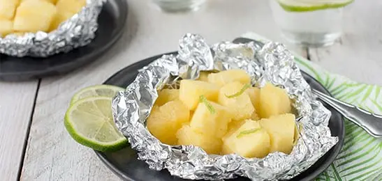 Verdeel de ananas over 2 stukken aluminiumfolie en vouw het aluminiumfolie goed dicht.