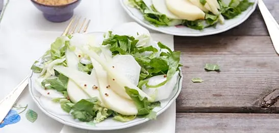 7. Verdeel de andijvie en rettich over 2 bordjes en druppel het sausje erover. Leg de plakjes peer erop en strooi het mosterdzaad erover.