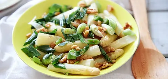 Schil de asperges en snijd het harde uiteinde er af. Snijd de asperges in stukken.