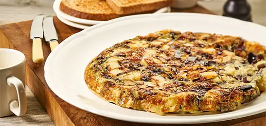 Een snelle omelet met aubergine en aardappel.
