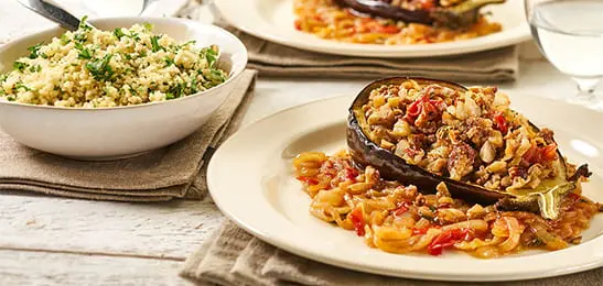 Serveer de bulgur bij de aubergine en de uiensaus.