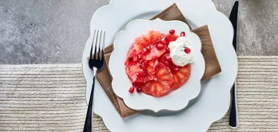 Een makkelijk te maken, verfrissend nagerecht met een perfecte balans tussen citrus, vanille en granaatappel.