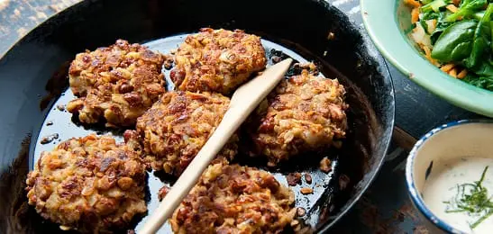 Verwarm de rest van de margarine en bak hierin de bonenburgers in 8 minuten gaar. Keer halverwege.