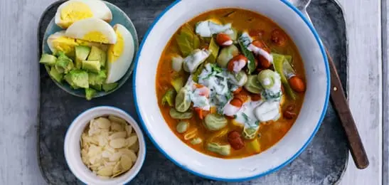 12. Garneer de soep met de kruidenkwark en serveer met ei, avocado en amandelen.