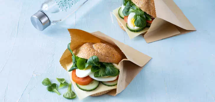 4. Beleg ieder broodje met een plak kaas, ei, tomaat, komkommer en wat veldsla.