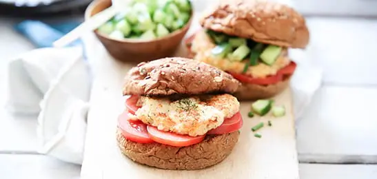Beleg de bolletjes de tomaat en visburger en serveer de komkommersalade erbij.