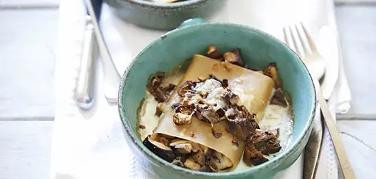 Deze gevulde lasagnebladen zijn geïnspireerd op cannelloni. Heerlijk met gedroogde en verse, gemengde paddenstoelen.