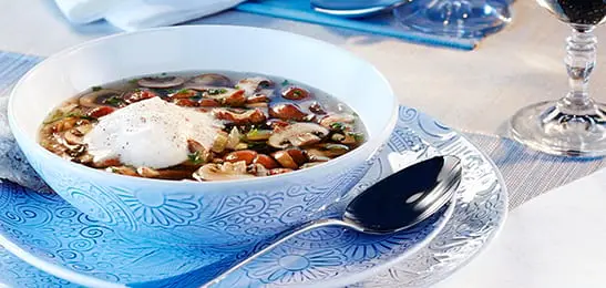 Vul kommen of borden met de soep. Garneer met het melkschuim en een beetje nootmuskaat.