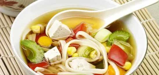 Doe de tofu, mais en de noedels in de soep en laat dat gaar worden.