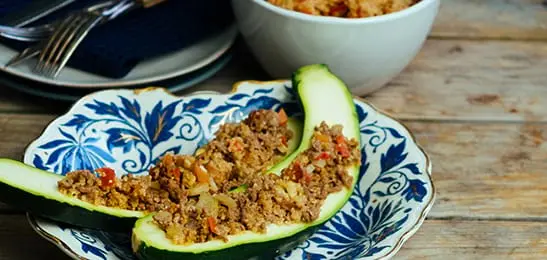 Vul de courgettehelften met het mengsel en zet de courgettes in een koekenpan of hapjespan. Giet er een bodempje water bij en laat de courgette in 25 minuten gaar worden.
