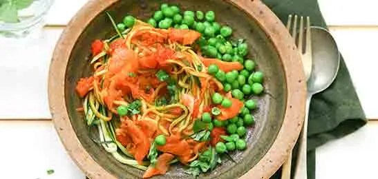 Schep de zalm en de courgettespaghetti door de tomatensaus en warm even door.