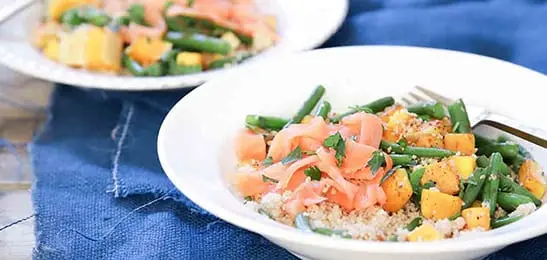 Verdeel de couscous over 2 kommen en garneer met de zalm en peterselie.