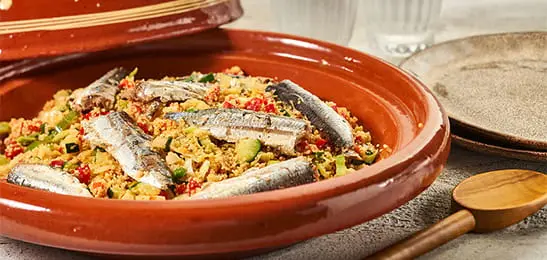Verwarm de olie uit het blikje sardientjes en fruit hierin de ui en de knoflook.