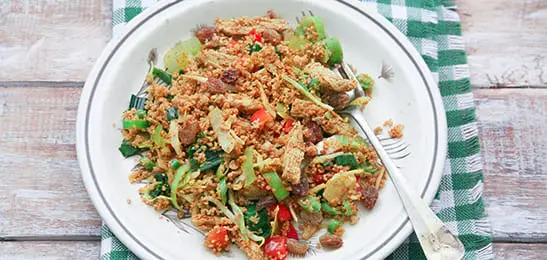 - Meng de rozijnen, komijn en koriander door de couscous.