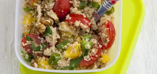 Heb je nog rijst of couscous over? Maak een lekkere salade met de producten die je nog in huis hebt. Deze couscoussalade staat snel op tafel en is ook een goed alternatief voor je boterham.