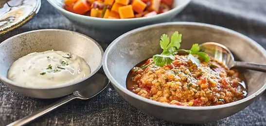 - Schep de groente en korianderyoghurt op de dahl en garneer de rest van de korianderblaadjes erover.