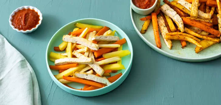 - Maak de aardappelen en groente schoon en snijd in frietvorm.