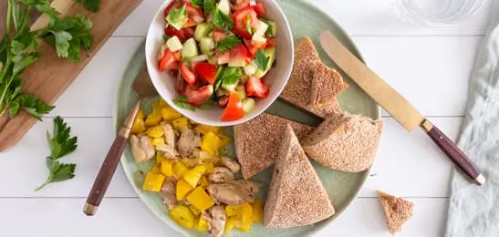 Serveer de kip en punten Turks brood bij de salade.
