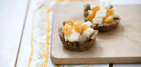Meng het fruit met de hüttenkäse en vul hiermee de bakjes.