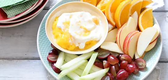 Leg het fruit op een schaal en serveer de mangodip er in een schaaltje bij.