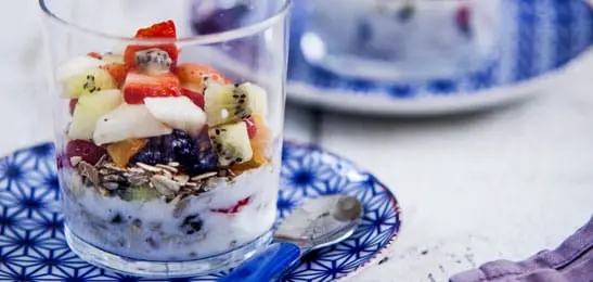 Schenk wat van de yoghurt in 2 hoge glazen of kommen.