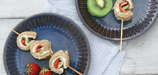 3. Bestrijk de boterhammen met de roomkaas, verdeel het fruit er over en rol ze op.