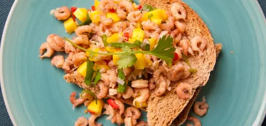 Leg op elk bord 2 driehoekjes brood. Schep de salsa ernaast en verdeel de garnalen erover.