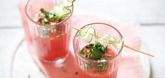 Schaaf van het stukje komkommer 4 dunne linten. Rijg de linten aan een spiesje. Leg de spiesjes op de soep.