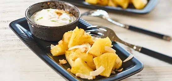 Bestrooi de ananas met de kokos en geef er de limoenyoghurt bij.