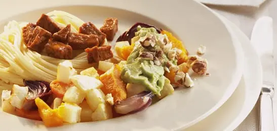 - Verdeel de dressing over de groente en strooi de hazelnoten erover. Serveer de tofu en pasta erbij.