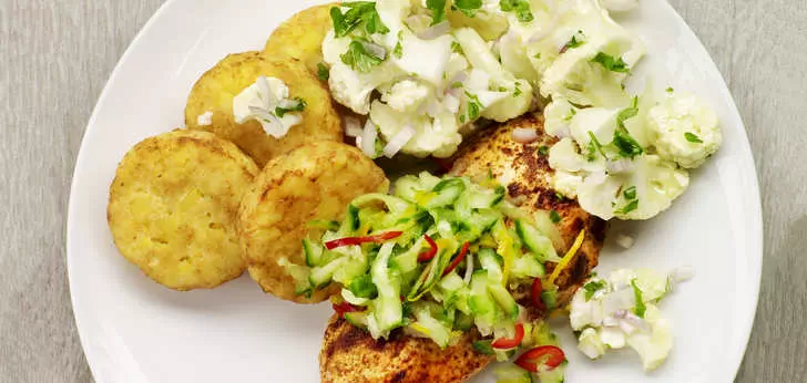 - Serveer de komkommersalsa, röstikoekjes en bloemkool bij de kip.