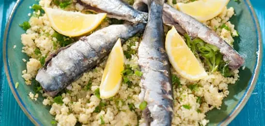 - Schep de couscous op een bord met de partjes citroen en leg de sardines erop. Serveer de wortelsalade erbij.