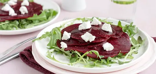 Schik de plakjes biet erop en verkruimel de geitenkaas erover.
