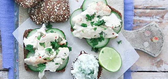 Beleg de broodjes met plakjes komkommer en verdeel de kip erover. Garneer met de rest van de verse koriander en een plakje limoen. Serveer de raita erbij.