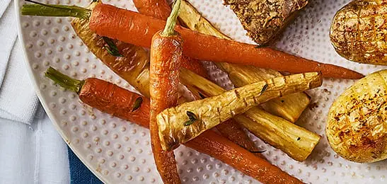Meng de groente met wat olie, de honing, wat tijmblaadjes en peper.