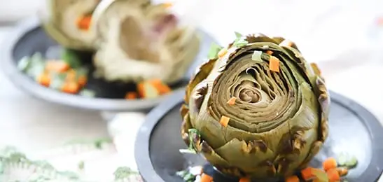 Trek de blaadjes eraf en eet het zachte deel. Als alle blaadjes op zijn, is het hooi zichtbaar. Verwijder het hooi met een lepel: dit is niet eetbaar. De overgebleven bodem is wel eetbaar.