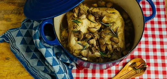 Sluit de pan met een deksel. Laat de kip in 50 minuten gaar sudderen.