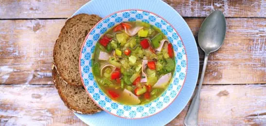 Serveer de soep met volkorenbrood en zuivelspread.