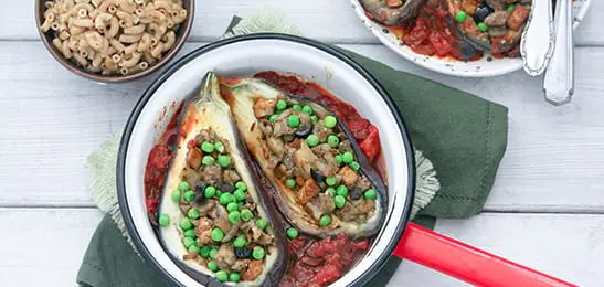 Recept van het Voedingscentrum: Gevulde aubergines met tomatensaus en macaroni
