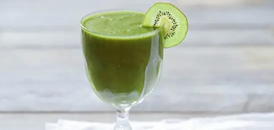 4. Doe de kiwi’s, het sinaasappelsap en het wortelsap bij de spinazie en klop het met een staafmixer tot een mooie groene shake.