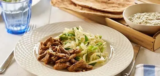 Snijd het vlees in repen schep ze door het kruidenmengsel. Laat het vlees afgedekt in de koelkast 1 uur marineren.