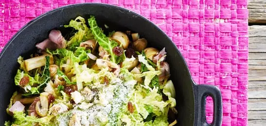 Voeg de champignons en rozijnen toe en roerbak het geheel verder gaar.