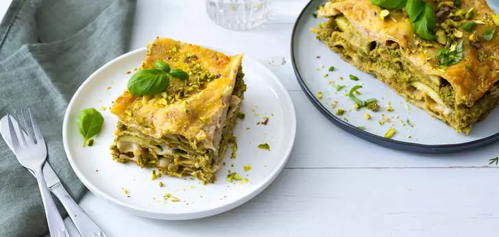 Hak de rest van pistachenoten fijn. Garneer de lasagne met de noten en de rest van de basilicum.